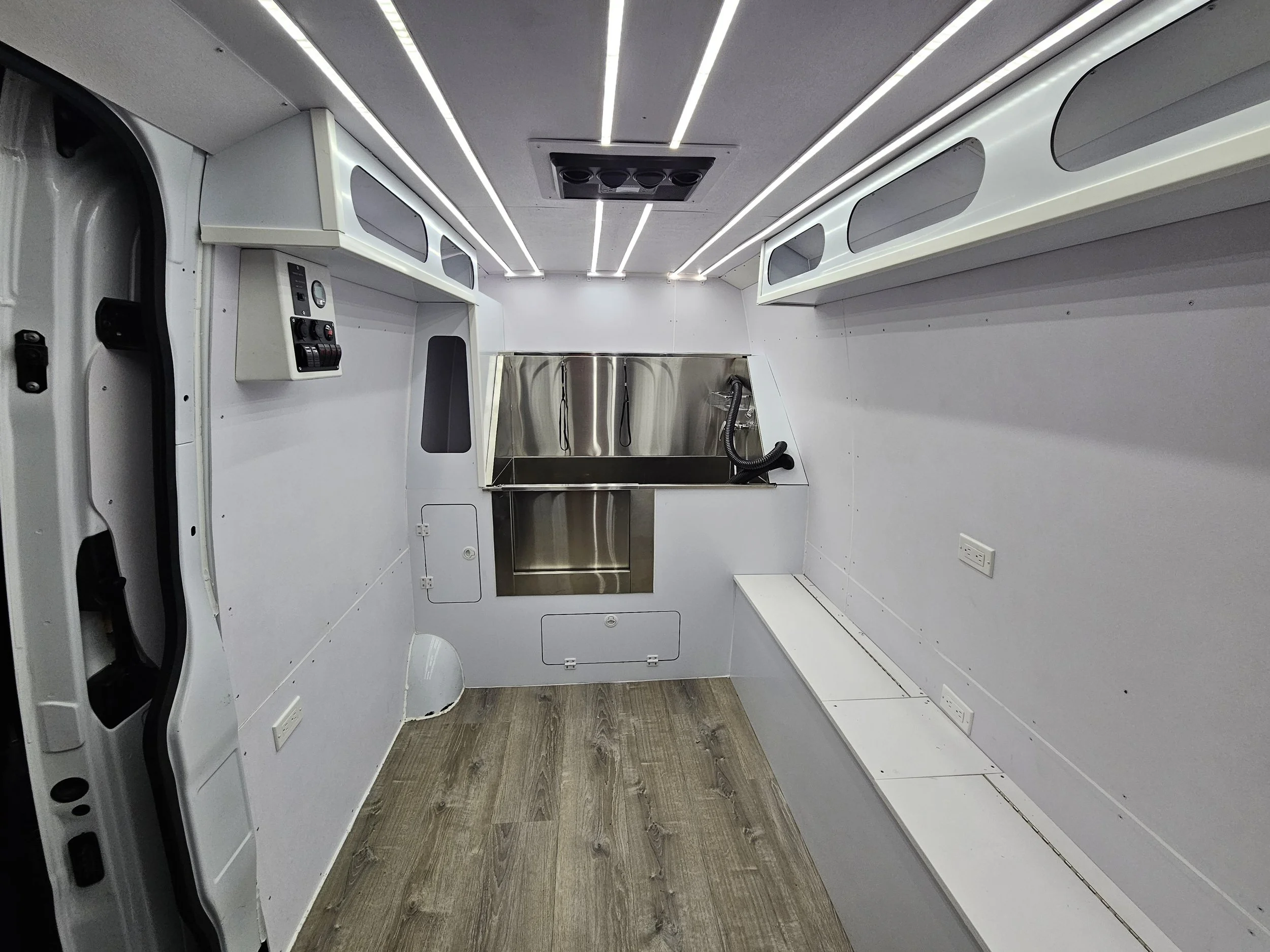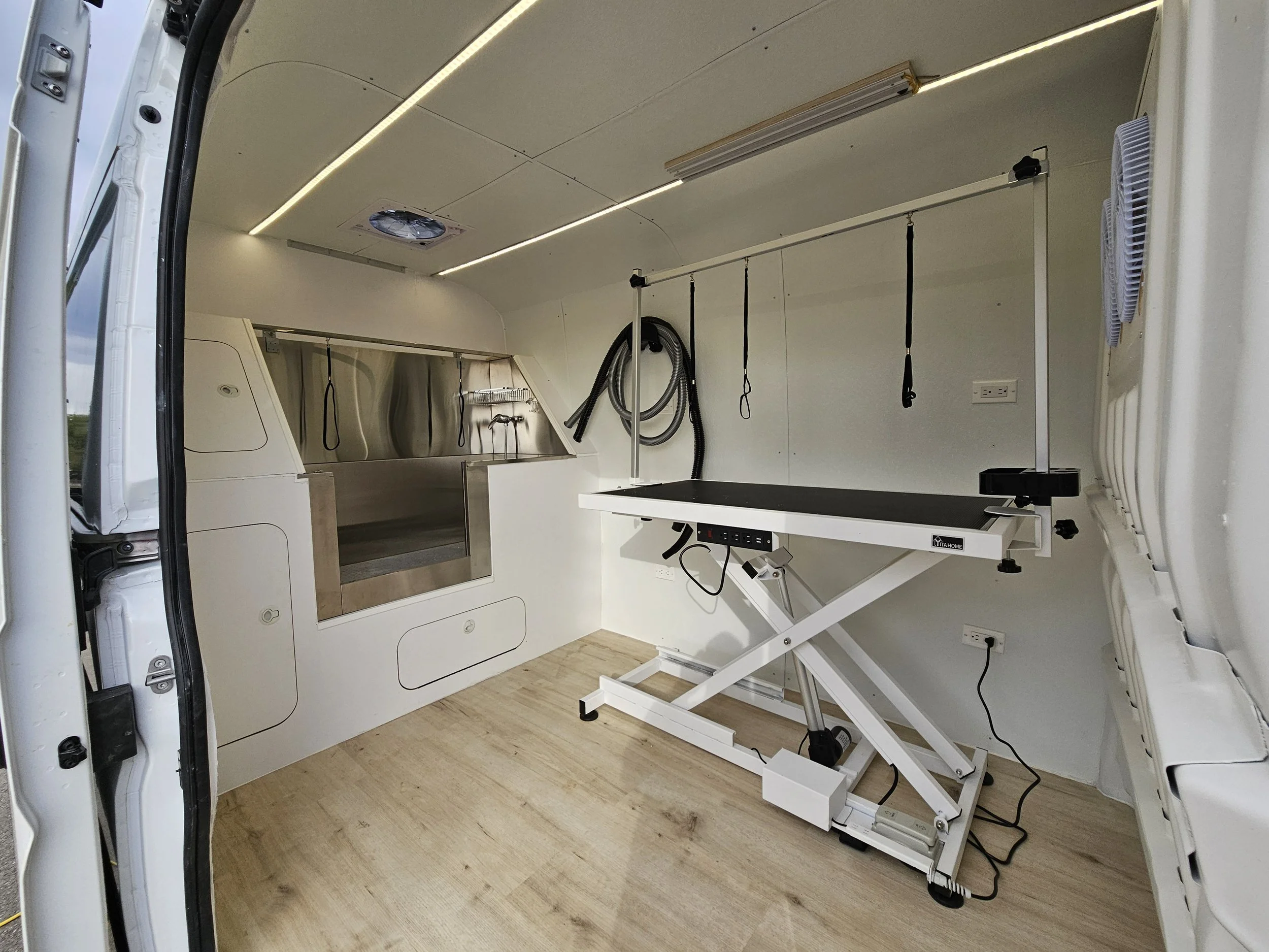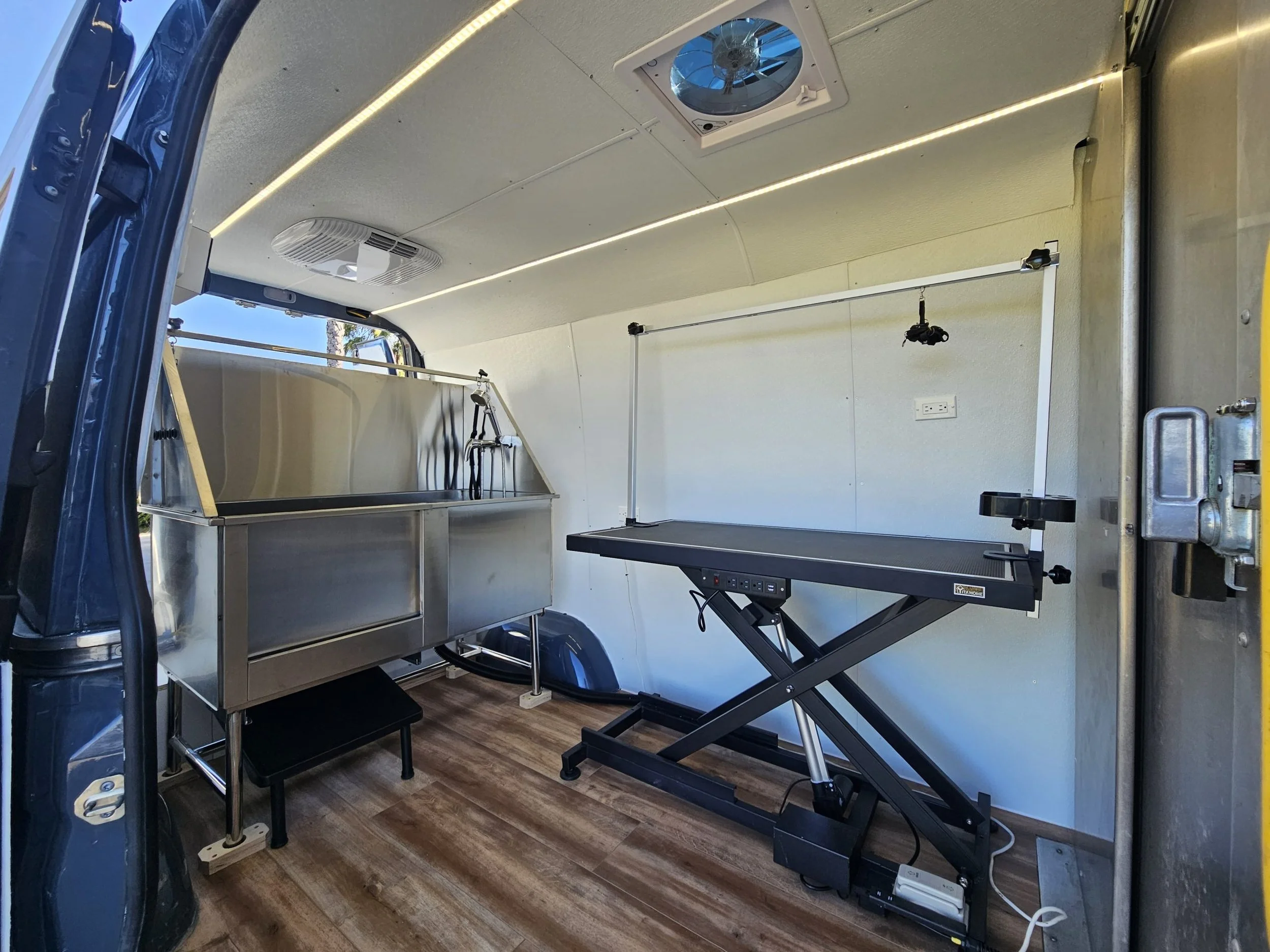 … or probably the only ones in California, or even the entire West Coast, who know how to build a 100% independent, off-grid dog grooming van. We were not aware of this, but this is what our customers told us. We build grooming vans which are a pleasure to work in. No noisy generator, no asking your customer to kindly let you use their electricity socket. With our vans you are able to enter areas where silence is required, and customers are willing to pay for the convenience. Our vans feature state-of-the-art lithium batteries, a very efficient inverter, ice-cold Air Conditioning but warm water. We usually also install a 65-gallon water tank, solar panels and all the necessary electronics to make it all work flawlessly for your entire day of work. No matter how long it is.
